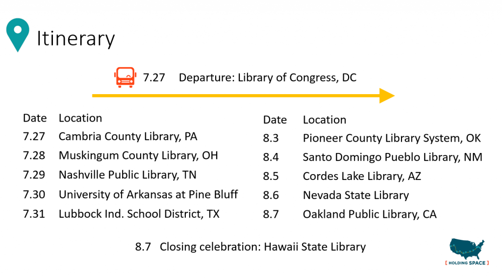 The tour kicks off on July 27, 2020 from the Library of Congress and winds its way across the country to Oakland, CA, on August 7, 2020.